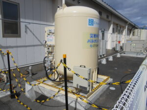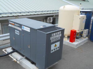 まるこ福祉会では災害時に備えた、ガスバルクによる発電システムの導入により電気、ガスの供給は勿論の事